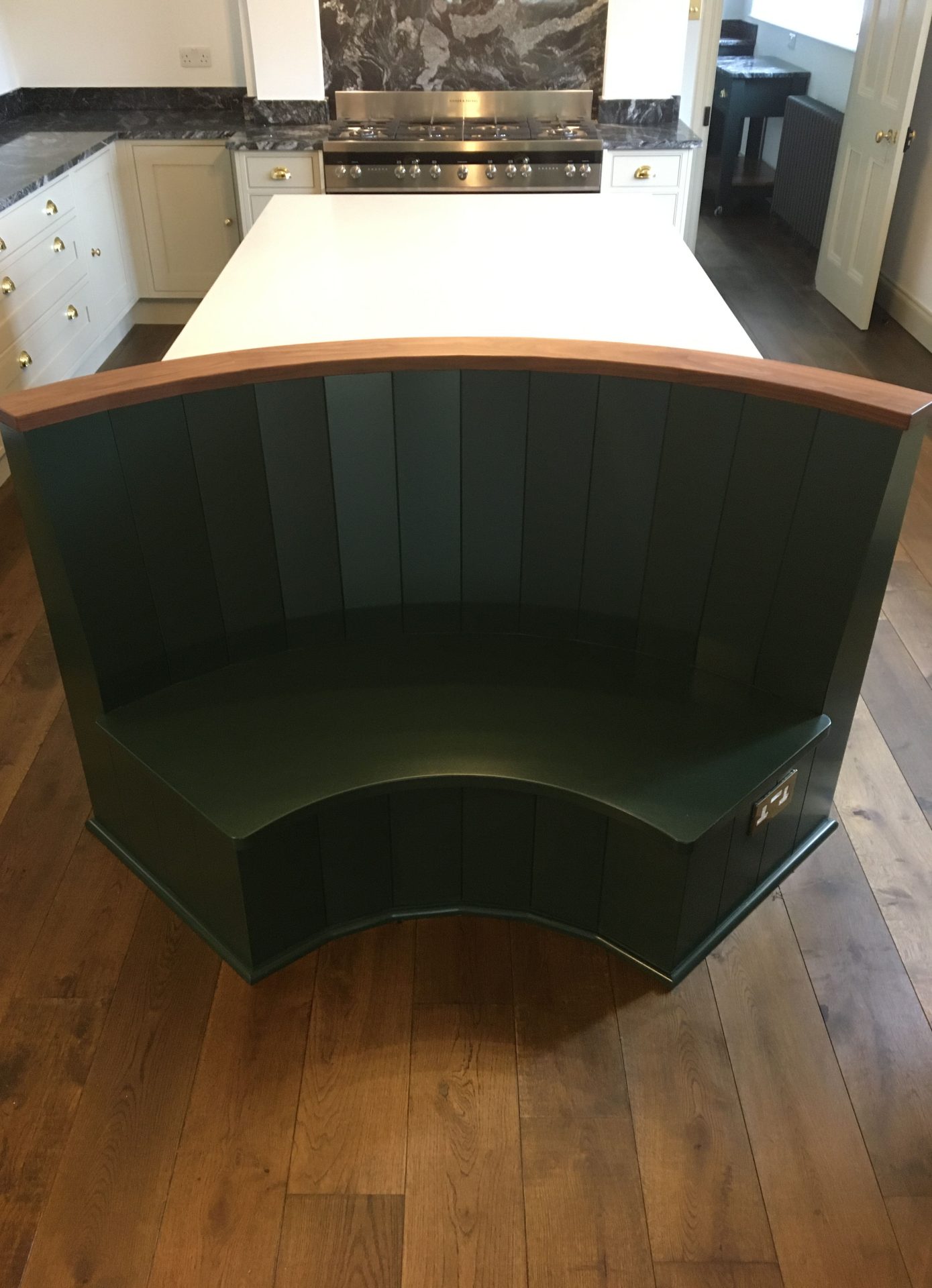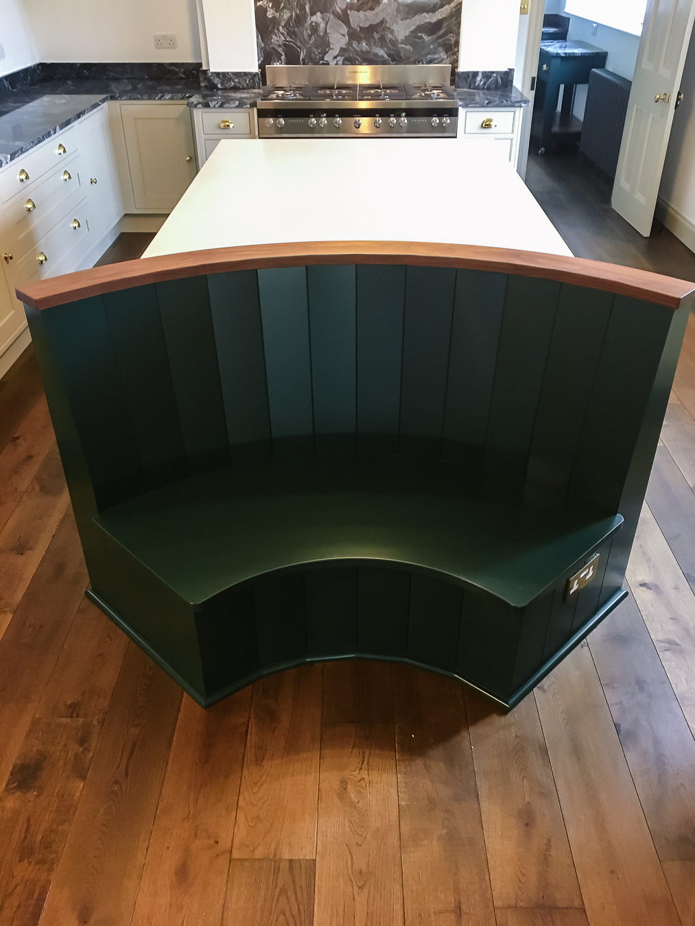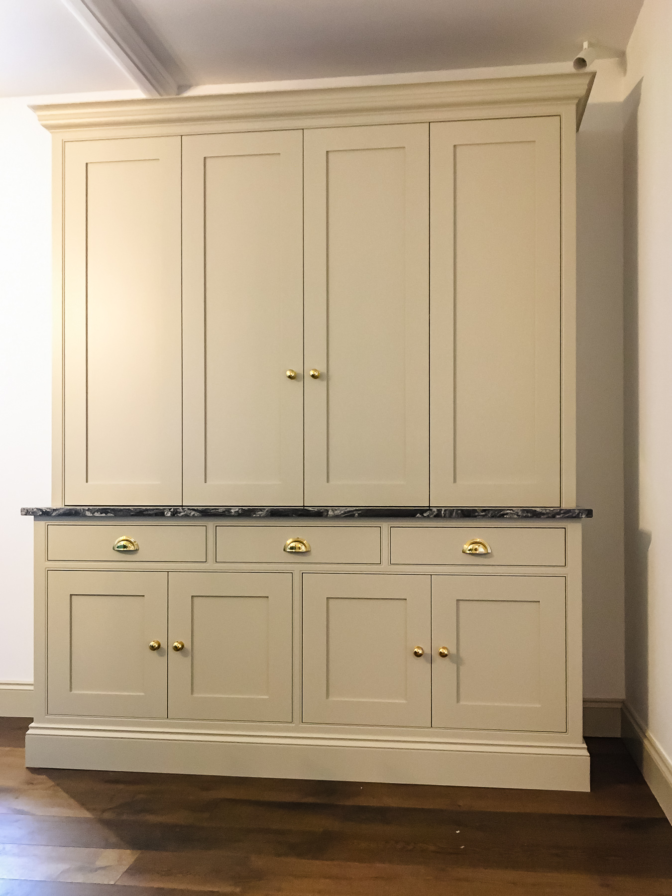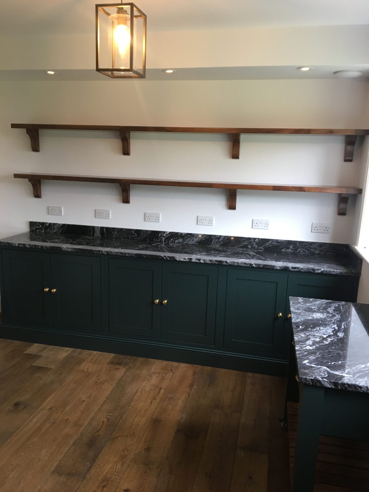 This bespoke Shaker-style kitchen features clean, simple lines, recessed panel cabinetry, and a soft, inviting finish that brings warmth and character to the heart of the home. Each element was handcrafted to measure, from the drawers and cupboards to the shelving and joinery details, ensuring a perfect fit and functional layout.