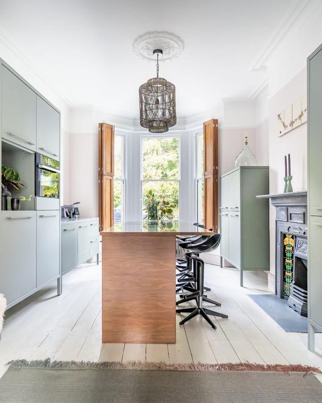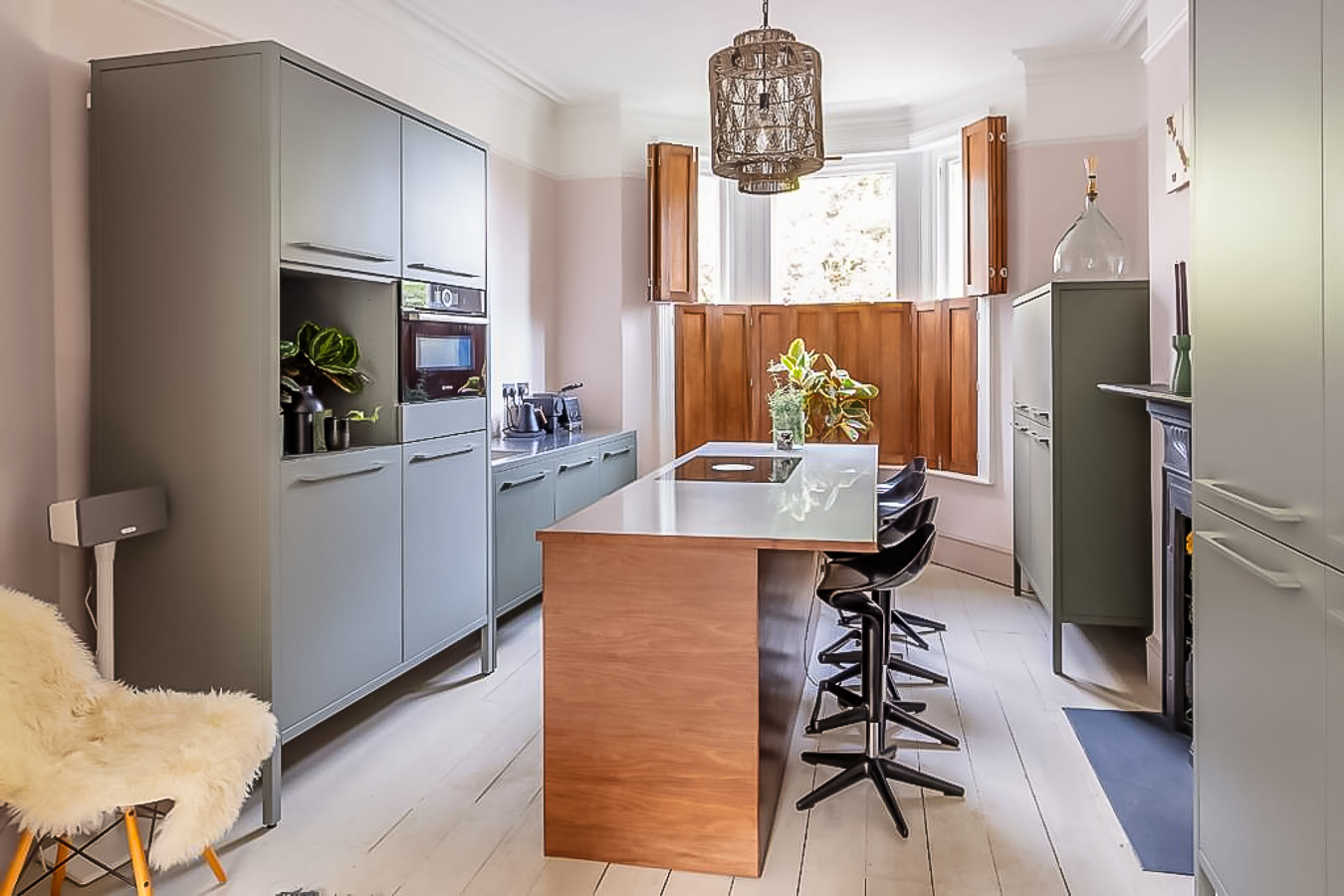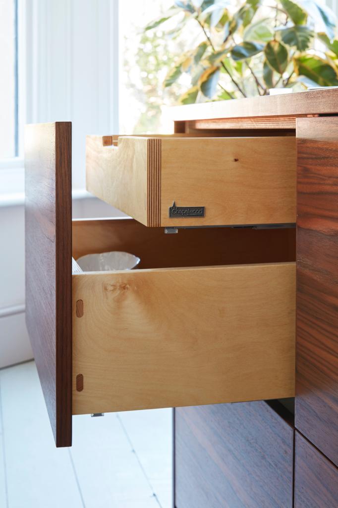 This bespoke walnut kitchen was designed to combine natural warmth with contemporary style. Every element — from the custom cabinetry and soft-close drawers to the integrated shelving and work surfaces — was made to measure for both practicality and visual harmony.